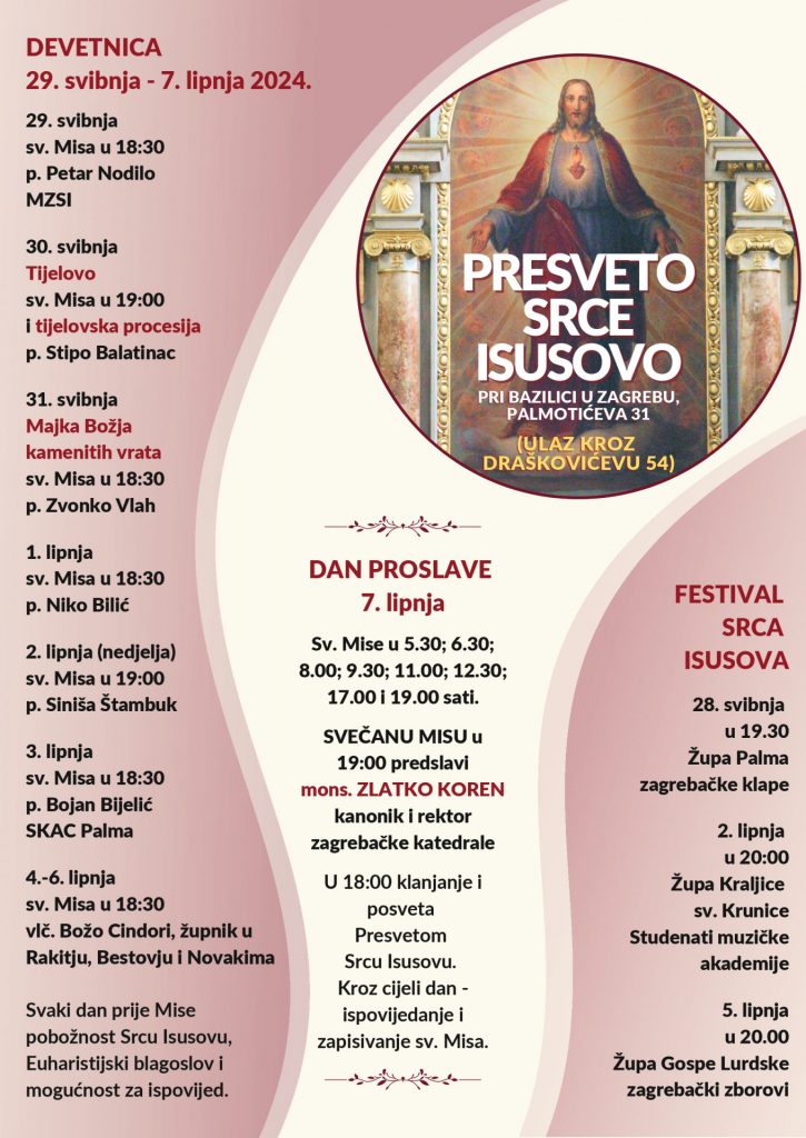 Mise će biti služene još u 5:30, 6:30; 8, 9:30, 11, 12:30 i 17 sati. U 18 sati će se održati klanjanje s posvetom Srcu Isusuvu i euharistijski blagoslov. Tijekom cijelog dana bit će mogućnost ispovijedanja i upisivanja nakana za mise.