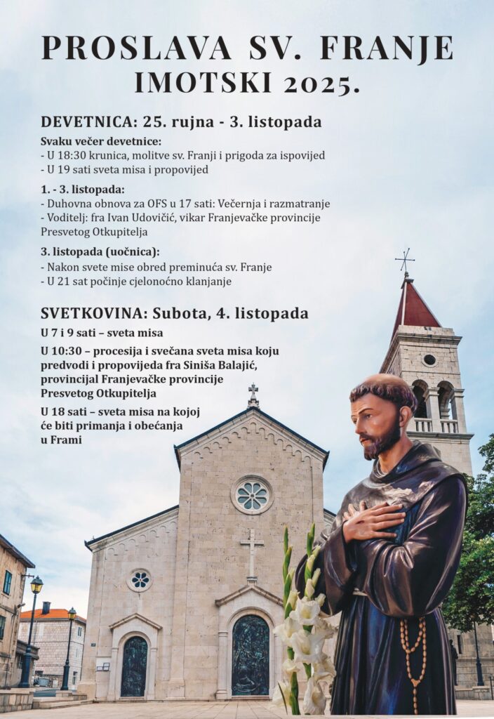 Svetkovina sv. Franje proslavit će se u subotu 4. listopada u Samostanu i Župi sv. Franje Asiškog u Imotskom. U 10:30 bit će procesija i slavit će se svečana misa koju predvodi i propovijeda provincijal Franjevačke provincije Presvetog Otkupitelja fra Siniša Balajić. U 18 je misa s primanjima i obećanjima u Frami, a mise će se slaviti i u 7 i 9 sati.