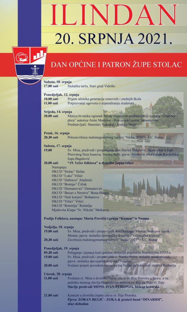 U ponedjeljak 19. srpnja u 19 sati je pobožnost sv. Iliji zatim misa koju predvodi i propovijeda: o. Stanko Pažin, stolački mladomisnik, pjeva stolačka djevojačka skupina „Angelus“.