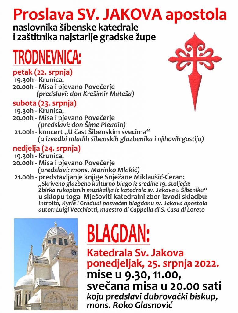 Šibenik, (IKA) – Svetkovina sv. Jakova apostola, naslovnika šibenske katedrale i zaštitnika najstarije gradske župe svečano će biti proslavljena u ponedjeljak 25. srpnja misama u 9.30, 11 i 20 sati.