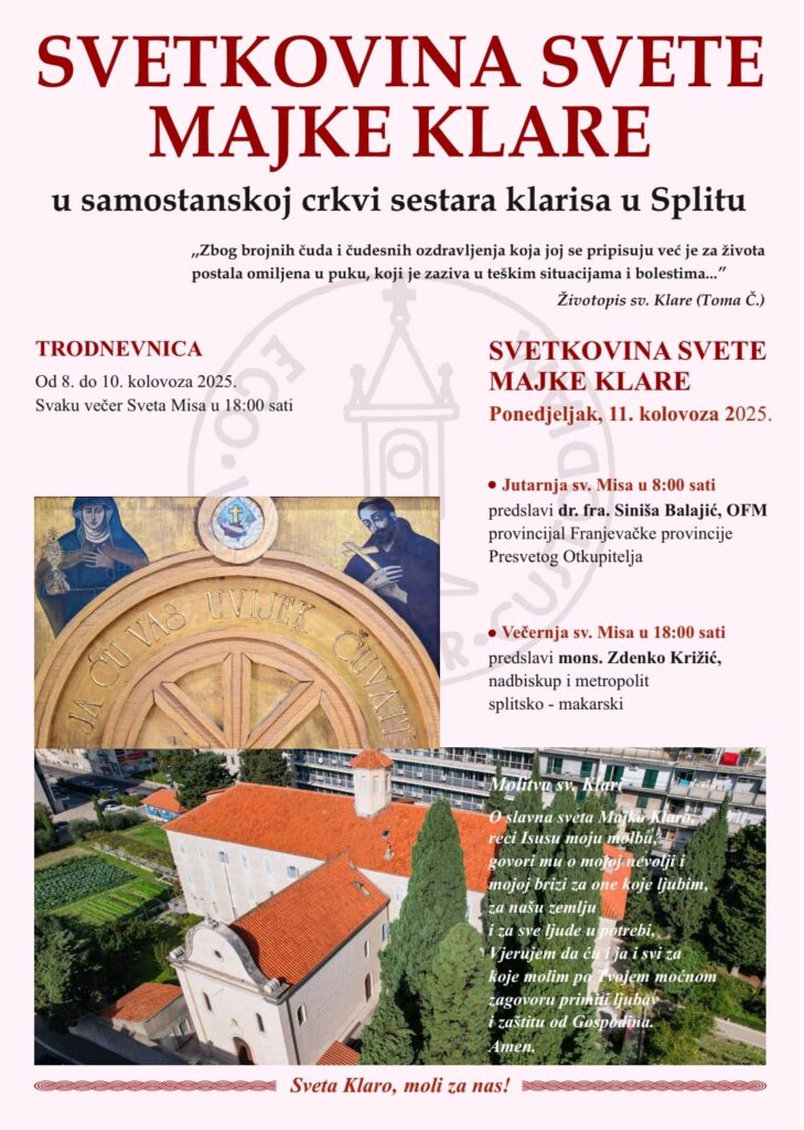 Središnja proslava svetkovine sv. Klare u samostanskoj crkvi sestara klarisa u Splitu održat će se 11. kolovoza s početkom u 18 sati. Misa slavlje će predvoditi splitsko-makarski nadbiskup Zdenko Križić.