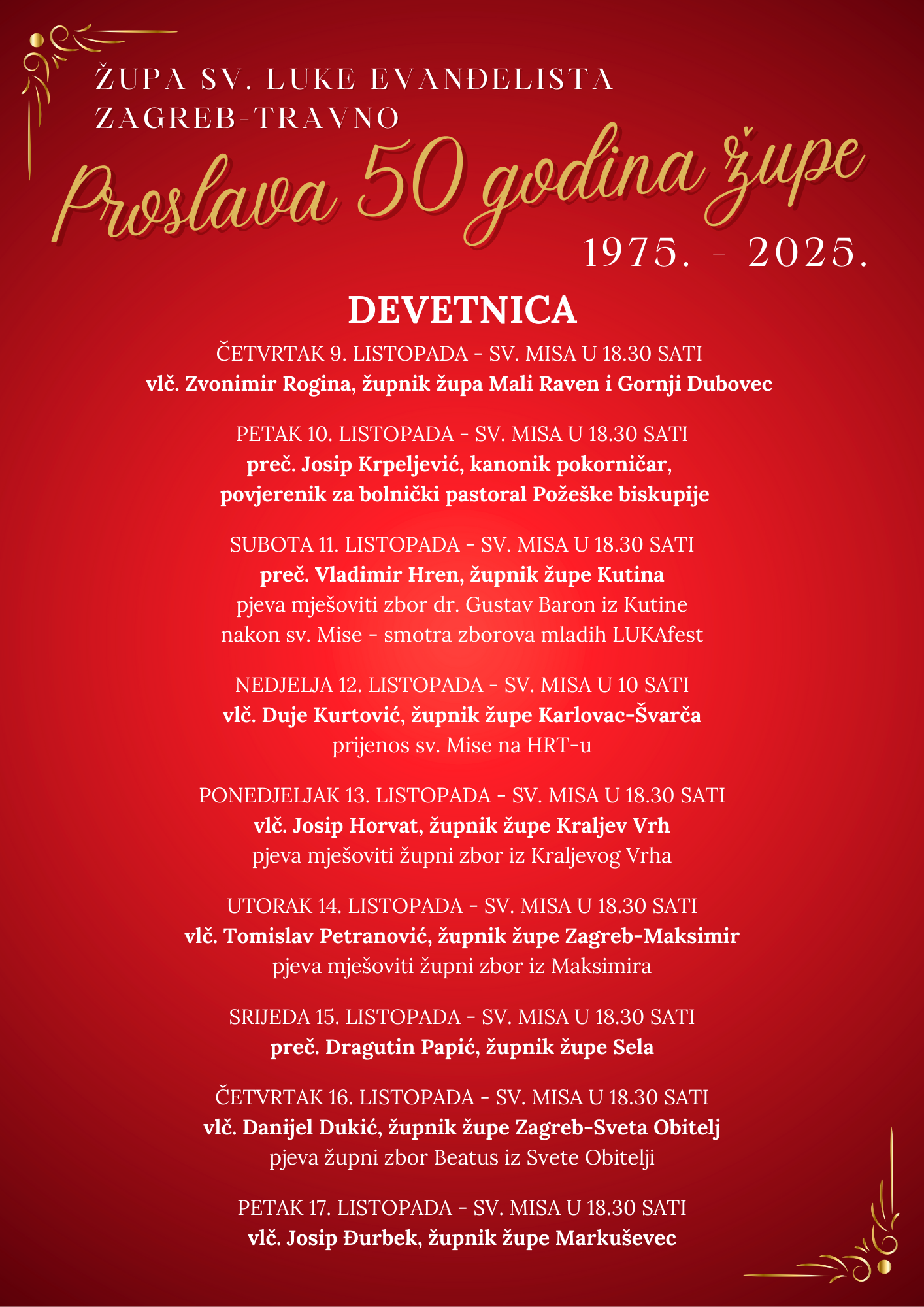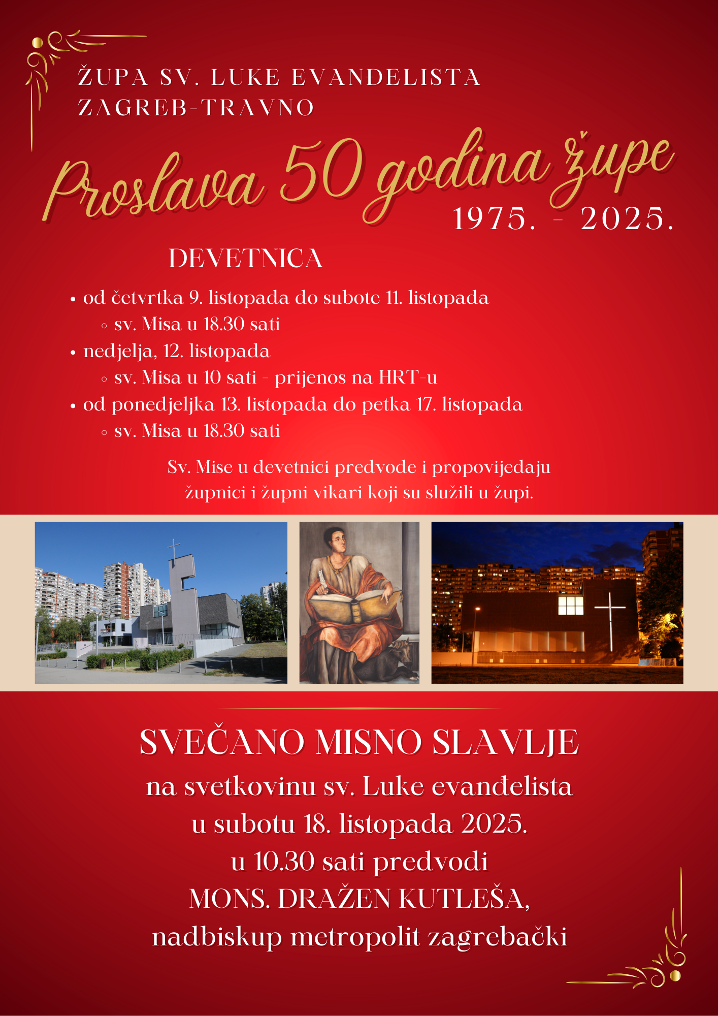 Župa sv. Luke evanđelista proslavit će 50 godina župe na župnu svetkovinu sv. Luke u subotu 18. listopada svečanim misnim slavlje u 10.30 sati koje će predvoditi zagrebački nadbiskup Dražen Kutleša. Župljani će se za proslavu jubileja pripremati devetnicom koju predvode župnici i župni vikari koji su služili u župi.