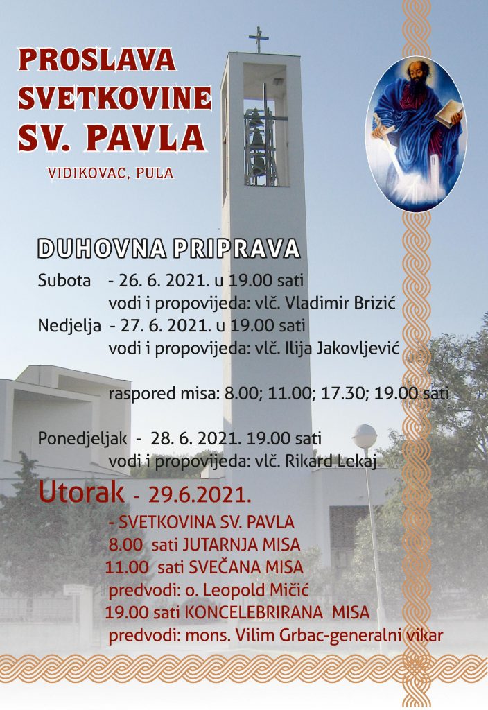 Pulska Župa sv. Pavla ap. će uoči svog župnog blagdana imati trodnevnu duhovnu pripravu, od 26. do 28. lipnja, svake večeri s početkom u 19 sati. Prve večeri, u subotu, 26. lipnja 2021. misno slavlje predvodit će vlč. Vladimir Brizić, župnik Galižane. Drugoga dana misu će slaviti vlč. mr. Ilija Jakovljević, vicepostulator u kauzi za kanonizaciju bl. Miroslava Bulešića. Trećega dana večernje misno slavlje predvodit će vlč. Rikard Lekaj, župnik pulske katedralne župe.