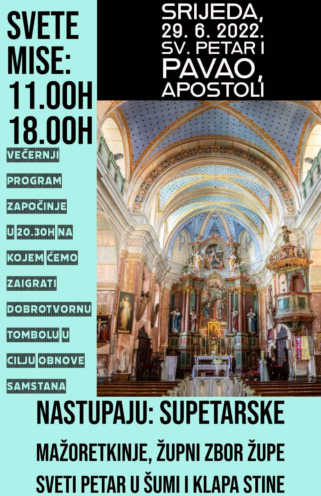 Župa sv. Petar u Šumi proslavit će svetkovinu apostolskih prvaka u srijedu 29. lipnja euharistijskim slavljima u 11 i 18 sati.