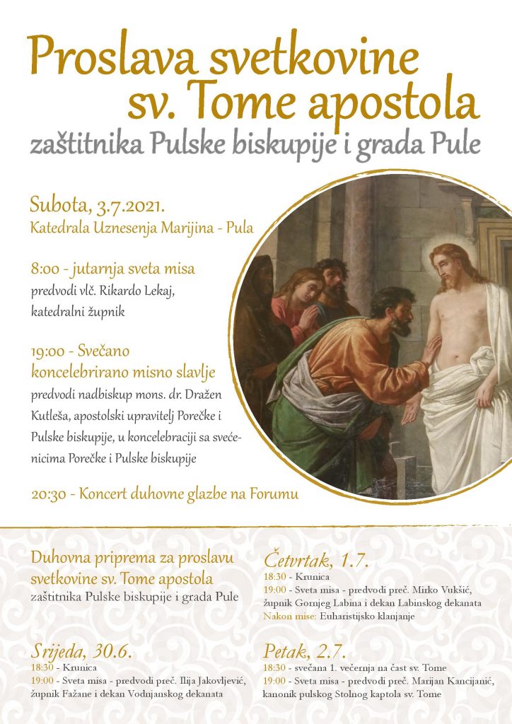 Pulska biskupija i Grad Pula svetkovinu svoga nebeskog zaštitnika sv. Tome apostola proslavit će četverodnevnim duhovnim događanjima, od srijede 30. lipnja do same svetkovine, u subotu 3. srpnja.