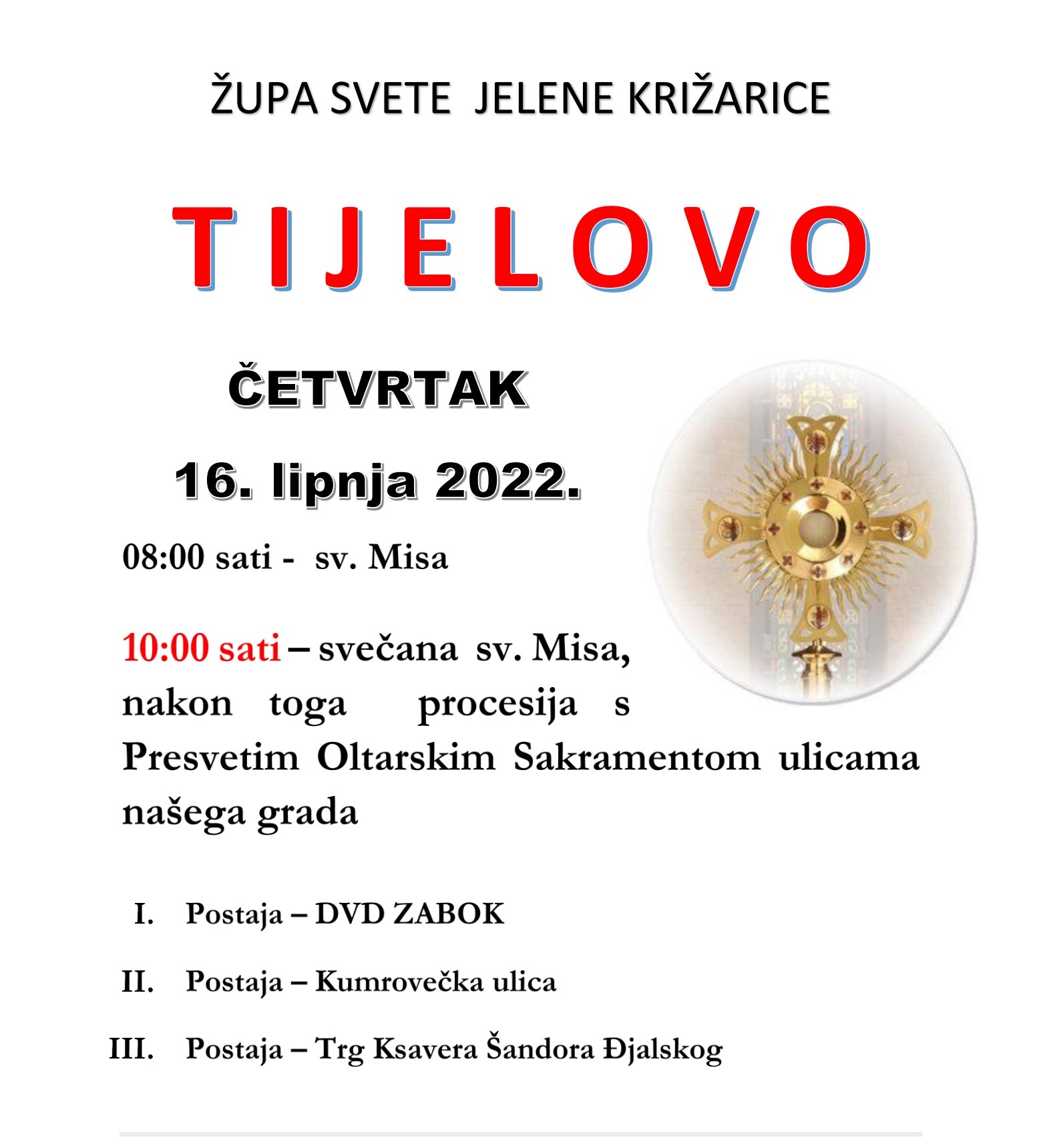 U četvrtak 16. lipnja slavi se svetkovina Predragocjenog Tijela i krvi Kristove – Tijelovo. Nakon svečane mise koja počinje u 10 sati uslijedit će procesija kroz grad.