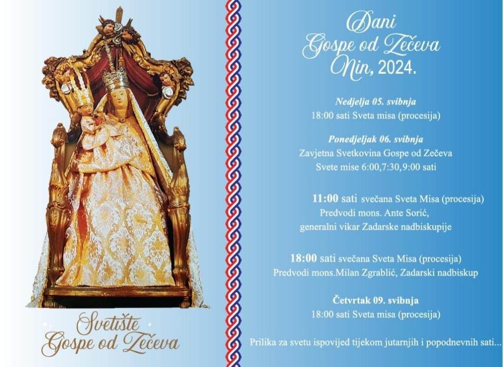 Nin, (IKA) – U središnjem marijanskom svetištu Zadarske nadbiskupije i jednom od najstarijih Gospinih svetišta u Hrvatskoj u gradu Ninu od 3. do 9. svibnja održat će se Dani Gospe od Zečeva.