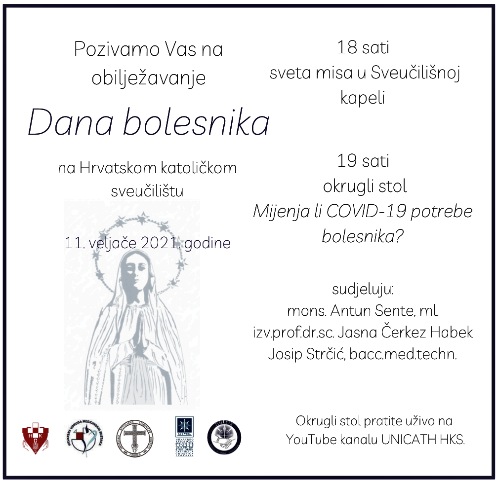 Zagreb, (IKA) – Svjetski dan bolesnika bit će proslavljen u četvrtak, 11. veljače u Sveučilišnoj kapeli na Hrvatskome katoličkom sveučilištu (Ilica 242, Zagreb).
