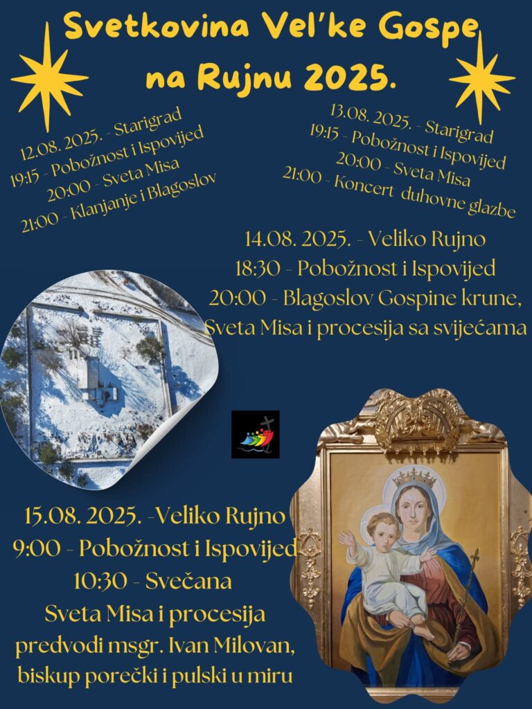 Na svetkovinu Velike Gospe u petak 15. kolovoza na Velikom Rujnu na Velebitu svečano misno slavlje u 10:30, potom procesiju sa slikom Gospe od Rujna, predvodi umirovljeni porečki i pulski biskup Ivan Milovan.