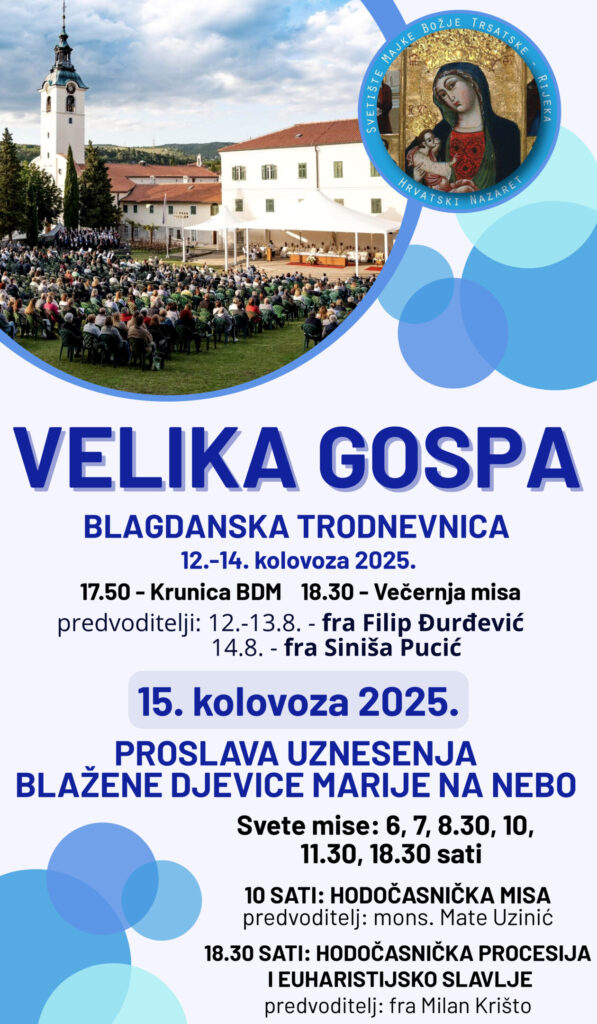 Na svetkovinu Velike Gospe 15. kolovoza u svetištu Majke Božje Trsatske središnju misu u 10 sati predslavit će riječki nadbiskup Mate Uzinić uz izravni prijenos na Hrvatskoj televiziji. To je ujedno zavjetna misa Riječke nadbiskupije i Grada Rijeke. Večernju misu u 18.30 predvodit će provincijal Hrvatske franjevačke provincije sv. Ćirila i Metoda, fra Milan Krišto.