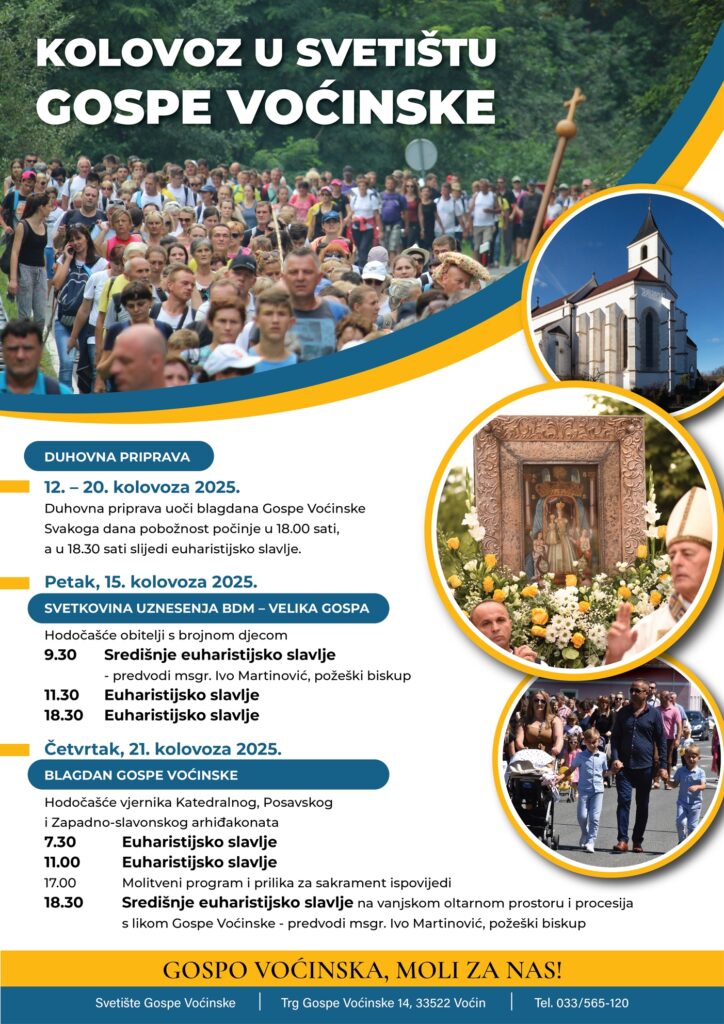 Središnje euharistijsko slavlje u 9:30 predvodit će požeški biskup Ivo Martinović, a ostala misna slavlja predviđena su u 11:30 i 18:30 sati. Tijekom cijelog dana očekuje se velik broj hodočasnika koji će u zajedništvu moliti i zahvaljivati Gospi Voćinskoj.