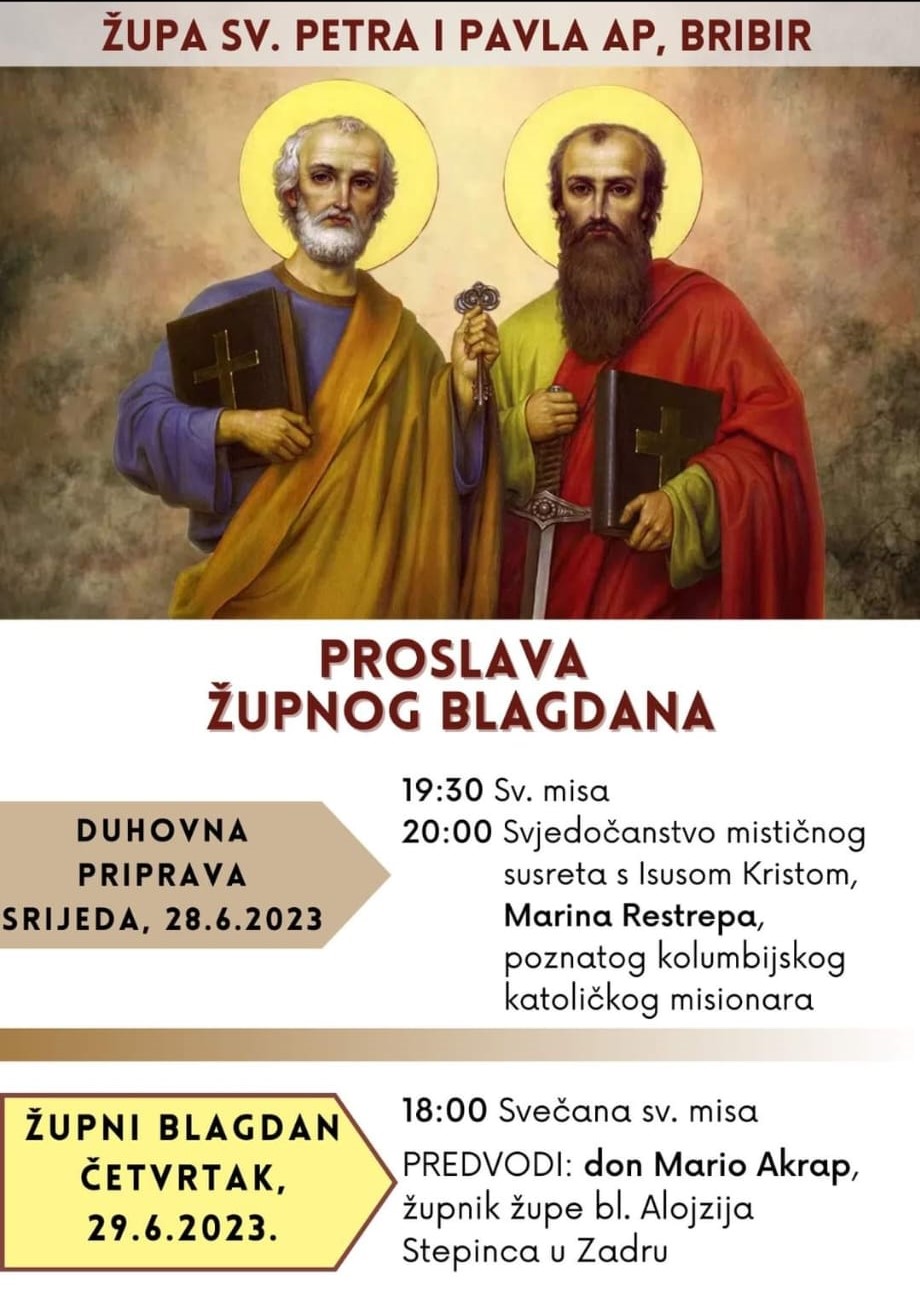 Župa sv. Petra i Pavla u Bribiru proslavit će župnu svetkovinu 29. lipnja. Misu u 18 sati predvodi don Mario Akrap, župnik Župe bl. Alojzija Stepinca u Zadru.