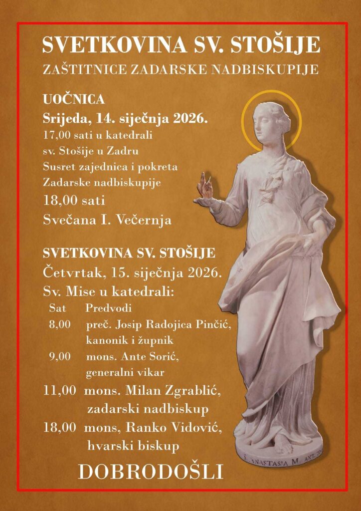Svetkovina sv. Stošije, zaštitnice Zadarske nadbiskupije proslavit će se u četvrtak 15. siječnja u katedrali sv. Stošije u Zadru. Misno slavlje u 11 sati predvodit će zadarski nadbiskup Milan Zgrablić, a u 18 sati hvarski biskup Ranko Vidović. Mise su još u 8 i 9 sati.