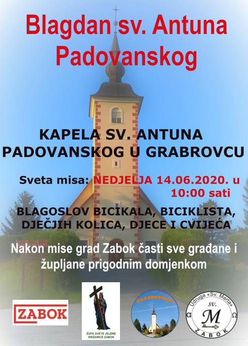 U zabočkoj župi u kapeli sv. Antuna u Grabrovcu, u nedjelju 14. lipnja, proslavit će se blagdan sv. Antuna Padovanskoga. Misno slavlje započet će u 10 sati.
