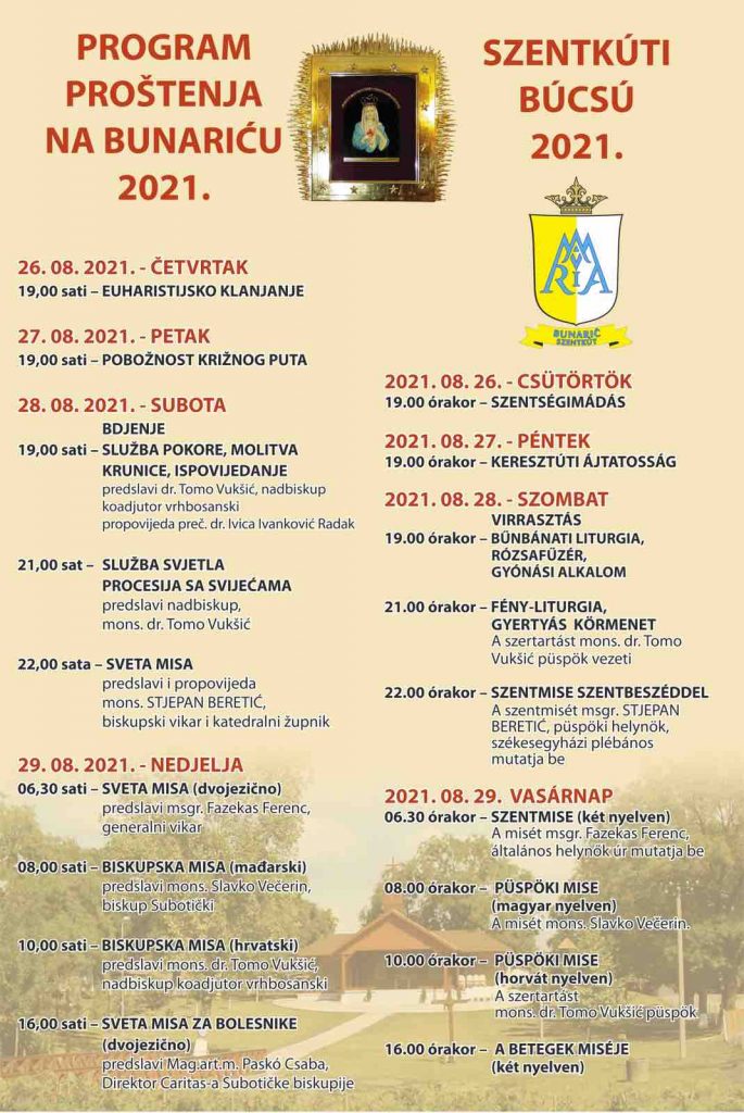 Proštenje u marijanskom svetištu Bunarić kod Subotice započet će pripravom u četvrtak 26. kolovoza u 19 sati euharistijskim klanjanjem. Sljedećega dana, u petak 27. kolovoza, u 19 sati bdijenje će započeti službom pokore i molitvom krunice. U 21 sat održat će se služba svijetla i procesija sa svijećama koje će predslaviti nadbiskup koadjutor vrhbosanski Tomo Vukšić. Misno slavlje u 22 sata predslavit će mons. Stjepan Beretić, vikar Subotičke biskupije i katedralni župnik. U nedjelju 29. kolovoza slavit će se više misa. Misu u 10 sati na hrvatskom jeziku predslavit će nadbiskup koadjutor vrhbosanski Tomo Vukšić.