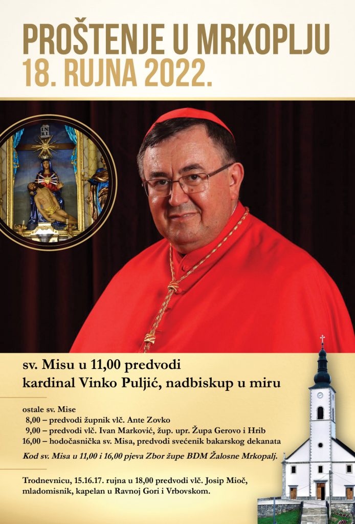 Župa Blažene Djevice Marije Žalosne u Mrkoplju na već tradicionalnom proštenju treće nedjelje u rujnu očekuje veliki broj hodočasnika. Mise će se 18. rujna služiti u 8, 9, 11 i 16 sati. Svečanu misu u 11 sati predslavit će umirovljeni vrhbosanski nadbiskup kardinal Vinko Puljić.