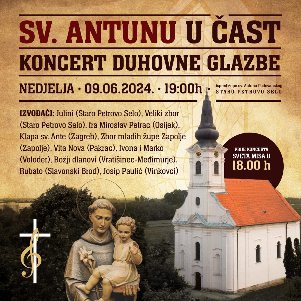 Novi koncertni festival popularne duhovne glazbe „Svetom Antunu u čast“ bit će održan u nedjelju 9. lipnja 2024. u Župi sv. Antuna Padovanskog u Starom Petrovom Selu.