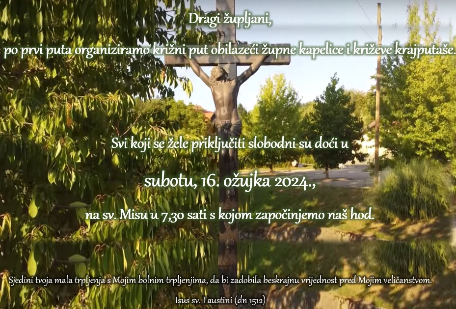 Zagreb, (IKA) – Prvi križni put po naselju Gajnice održat će se u subotu 16. ožujka. Hod za raspelom počinje misom u 7.30 u župnoj crkvi. Postaje će biti župne kapelice i križevi krajputaši.