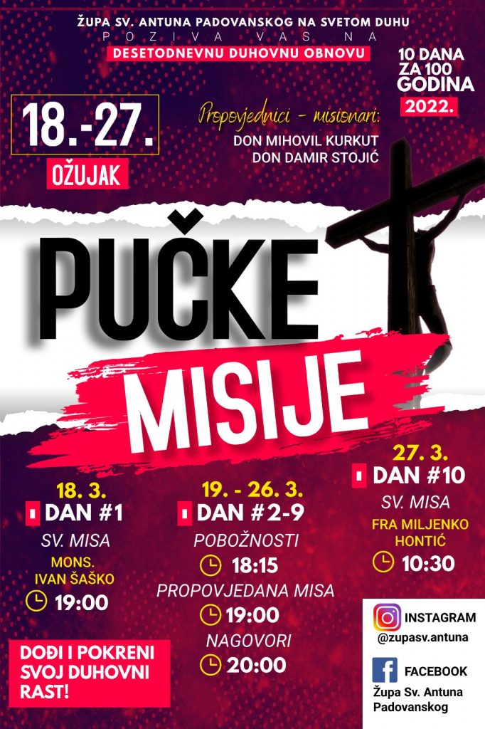 U Župi sv. Antuna Padovanskoga na zagrebačkom Svetom Duhu od petka 18. do nedjelje 27. ožujka bit će održane Pučke misije. Misionari će biti salezijanci don Damir Stojić i don Mihovil Kurkut. U službu će ih prvoga dana tijekom slavlja euharistije u 19 sati uvesti zagrebački pomoćni biskup Ivan Šaško.