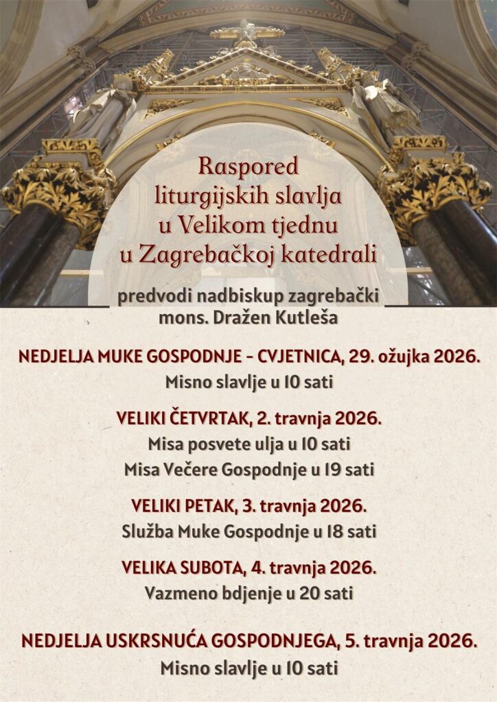 Zagrebački nadbiskup Dražen Kutleša predvodit će euharistijska slavlja i obrede Velikog tjedna u zagrebačkoj katedrali, prema sljedećem rasporedu: