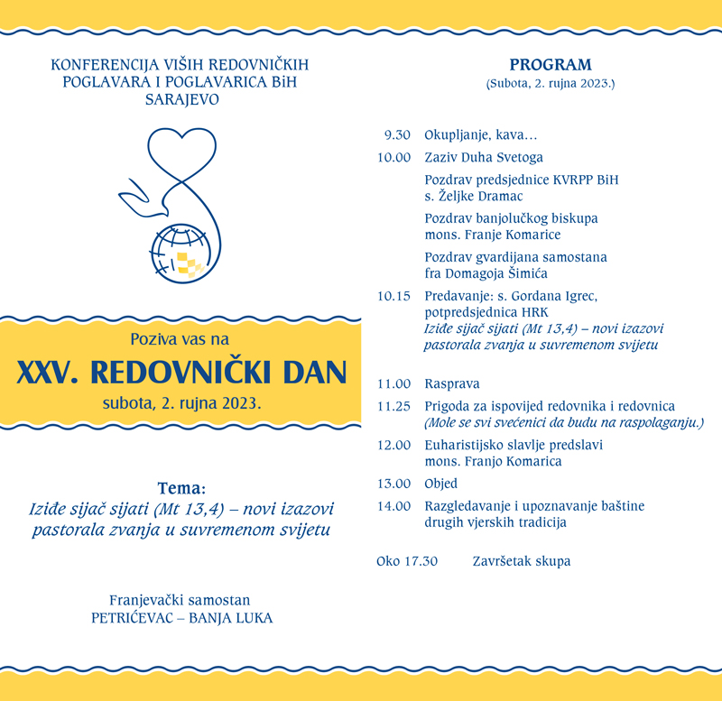 Program će započeti u 9.30 uvodnom molitvom te pozdravom i dobrodošlicom predsjednice Konferencije viših redovničkih poglavara i poglavarica Bosne i Hercegovine s. Željke Dramac. Prigodnu riječ uputit će banjolučki biskup Franjo Komarica te domaćin gvardijan samostana fra Domagoj Šimić. Redovnički dan moderirat će s. Danijela Anić, ASC.