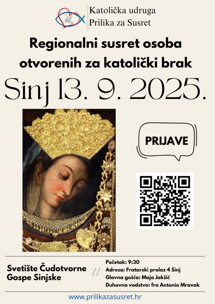 Regionalni susret osoba otvorenih za katolički brak održat će se u subotu, 13. rujna, s početkom u 9:30 u Svetištu Čudotvorne Gospe Sinjske u Sinju.