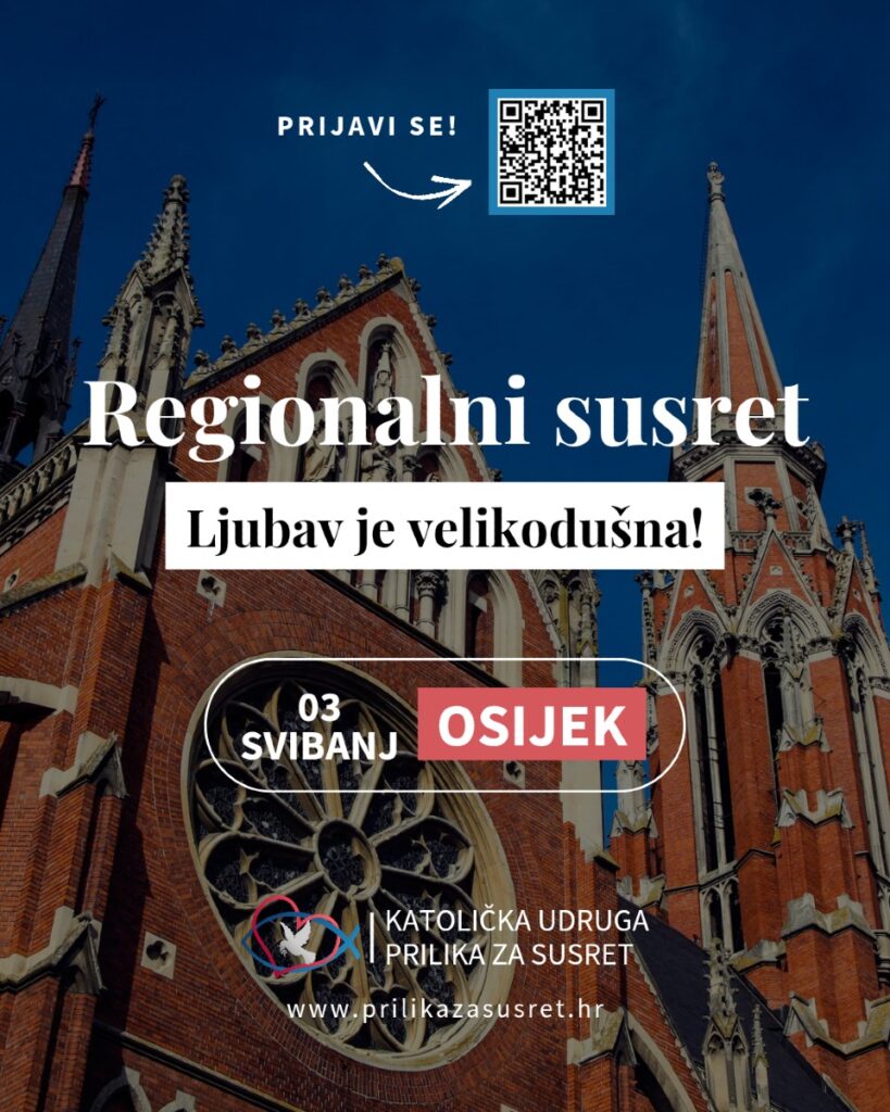 Katolička udruga „Prilika za Susret“ organizira jubilarni 10. regionalni susret koji će se pod geslom „Ljubav je velikodušna“ održati u subotu 3. svibnja u Vikarijatu Đakovačko-Osječke nadbiskupije u Osijeku. Susret je namijenjen osobama između 27 i 50 godina koje su slobodne sklopiti sakrament ženidbe. Ujedno je jedinstvena prilika za upoznati nove ljude, produbiti vjeru, naučiti nešto novo i duhovno se obogatiti. Kroz molitvu, predavanja, radionice i zajedništvo, pruža se prilika za upoznavanje, osobnu izgradnju i međusobnu podršku.