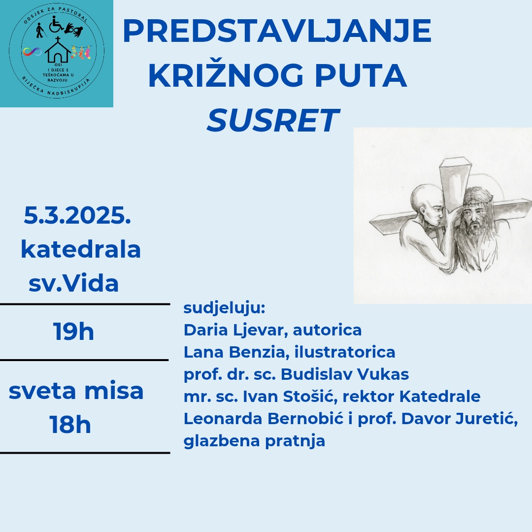 Nakon mise, 19 sati je predstavljanje Križnog puta “Susret”, autorice Darie Ljevar. Događaj organizira Odsjek za pastoral osoba s invaliditetom i djece s teškoćama u razvoju. Uz autoricu, o djelu će govoriti: član Odsjeka prof. dr. sc. Budislav Vukas, rektor katedrale mr. Ivan Stošić i ilustratorica Lana Benzia. U glazbenom dijelu programa nastupa Leonarda Bernobić uz glazbenu pratnju prof. Davora Juretića.