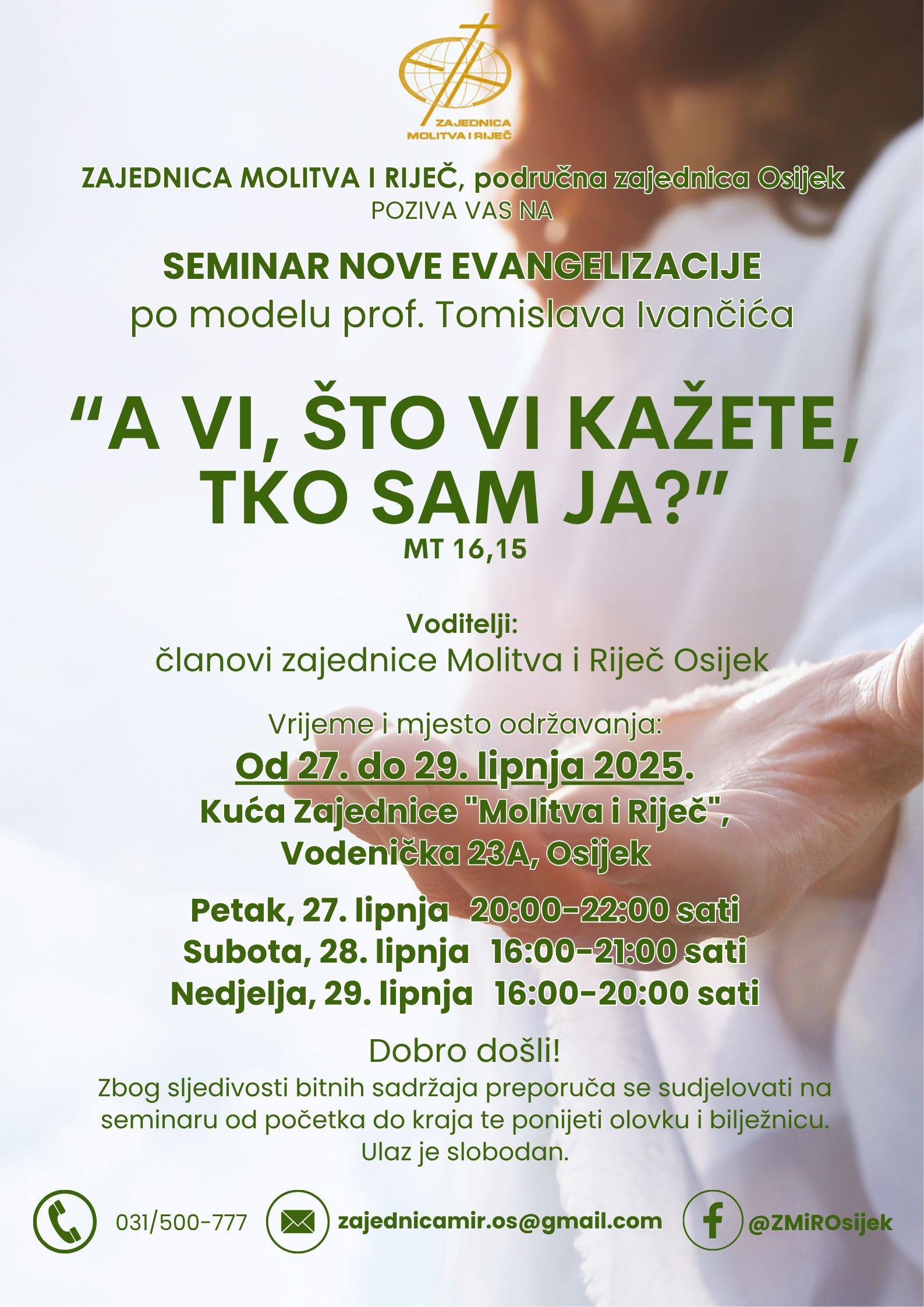 Zajednica „Molitva i Riječ“ organizira, od 27. do 29. lipnja, trodnevni seminar nove evangelizacije po metodi prof. Tomislava Ivančića, temeljen na evanđelju, molitvi i osobnoj odluci vjere, o temi: „A vi, što vi kažete, tko sam ja? (Mt 16,15)“. Seminar će biti održan u Kući Zajednice „Molitva i Riječ“ u Osijeku (Vodenička 23a).