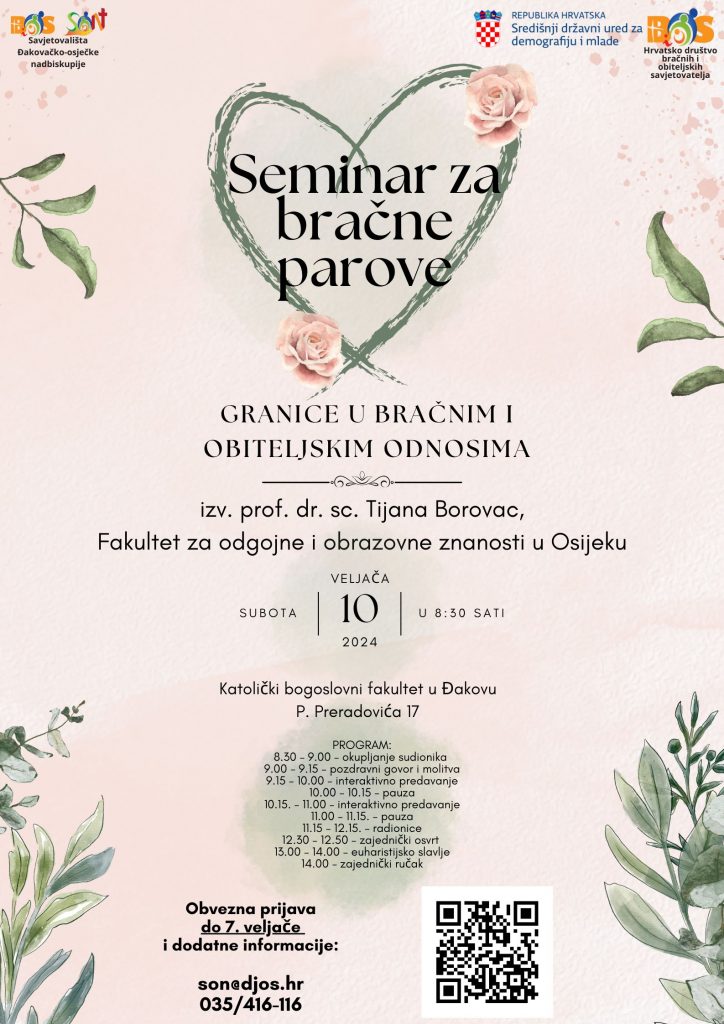 Đakovo, (IKA/TU) – Seminar za bračne parove u organizaciji Bračnog i obiteljskog savjetovališta Đakovačko osječke nadbiskupije o temi „Granice u bračnim i obiteljskim odnosima“ održat će se 10. veljače s početkom u 8:30 sati u prostorima Katoličkoga bogoslovnog fakulteta u Đakovu. Program će voditi izv. prof. dr. sc. Tijana Borovac.