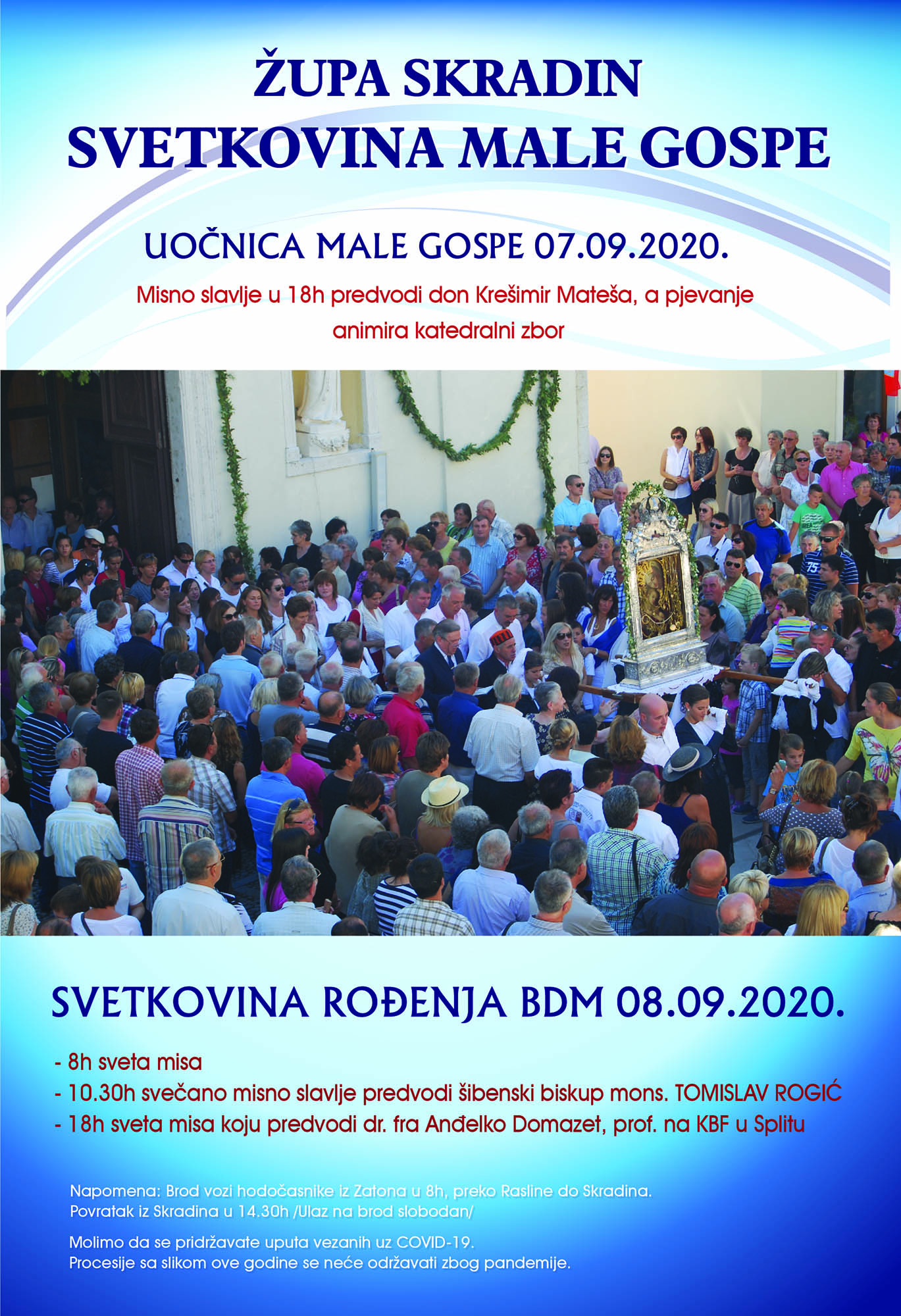 Uz središnje misno slavlje u 10.30, mise na Malu Gospu u Župi Skradin na rasporedu su u 8 i u 18 sati (predvodi dr. fra Anđelko Domazet, profesor na Katoličkom bogoslovnom fakultetu u Splitu).