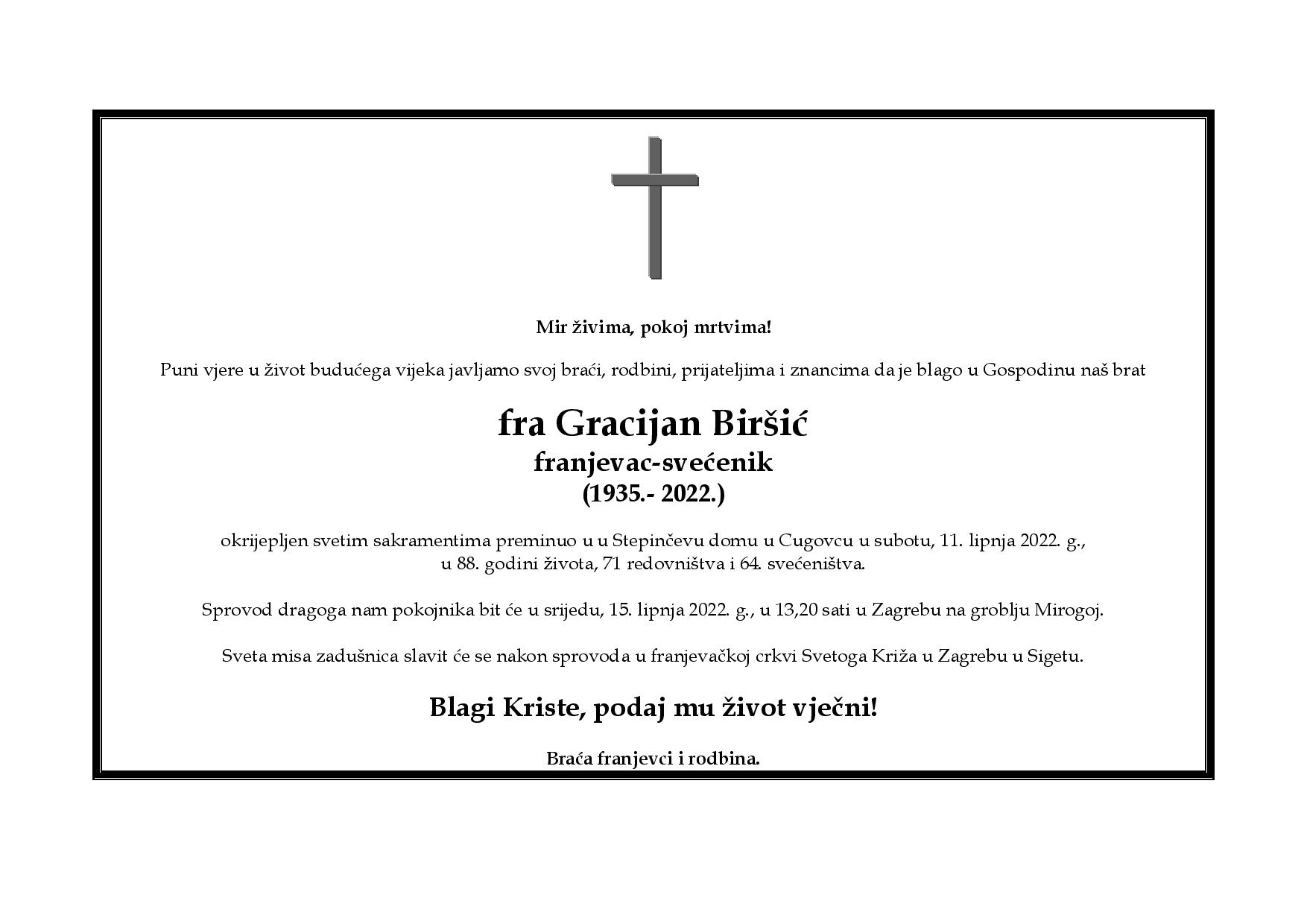 Sprovod pok. fra Gracijana Biršića bit će u srijedu 15. lipnja, u 13,20 sati na groblju Mirogoj u Zagrebu. Sveta misa zadušnica bit će nakon sprovoda u franjevačkoj crkvi Svetoga Križa u Zagrebu u Sigetu.