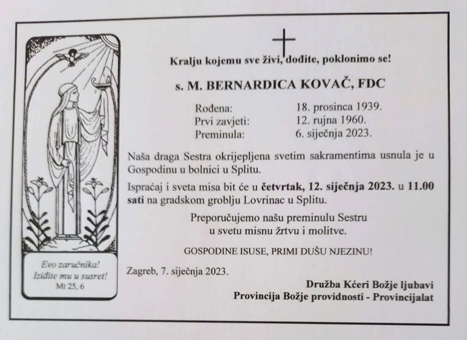 Sprovod pokojne s. Ljubice Bernardice Kovač bit će u četvrtak, 12. siječnja u 11 sati na gradskom groblju Lovrinac u Splitu. Redovnica Družbe Kćeri Božje Ljubavi s. Ljubica Bernardica Kovač preminula je u petak, 6. siječnja.