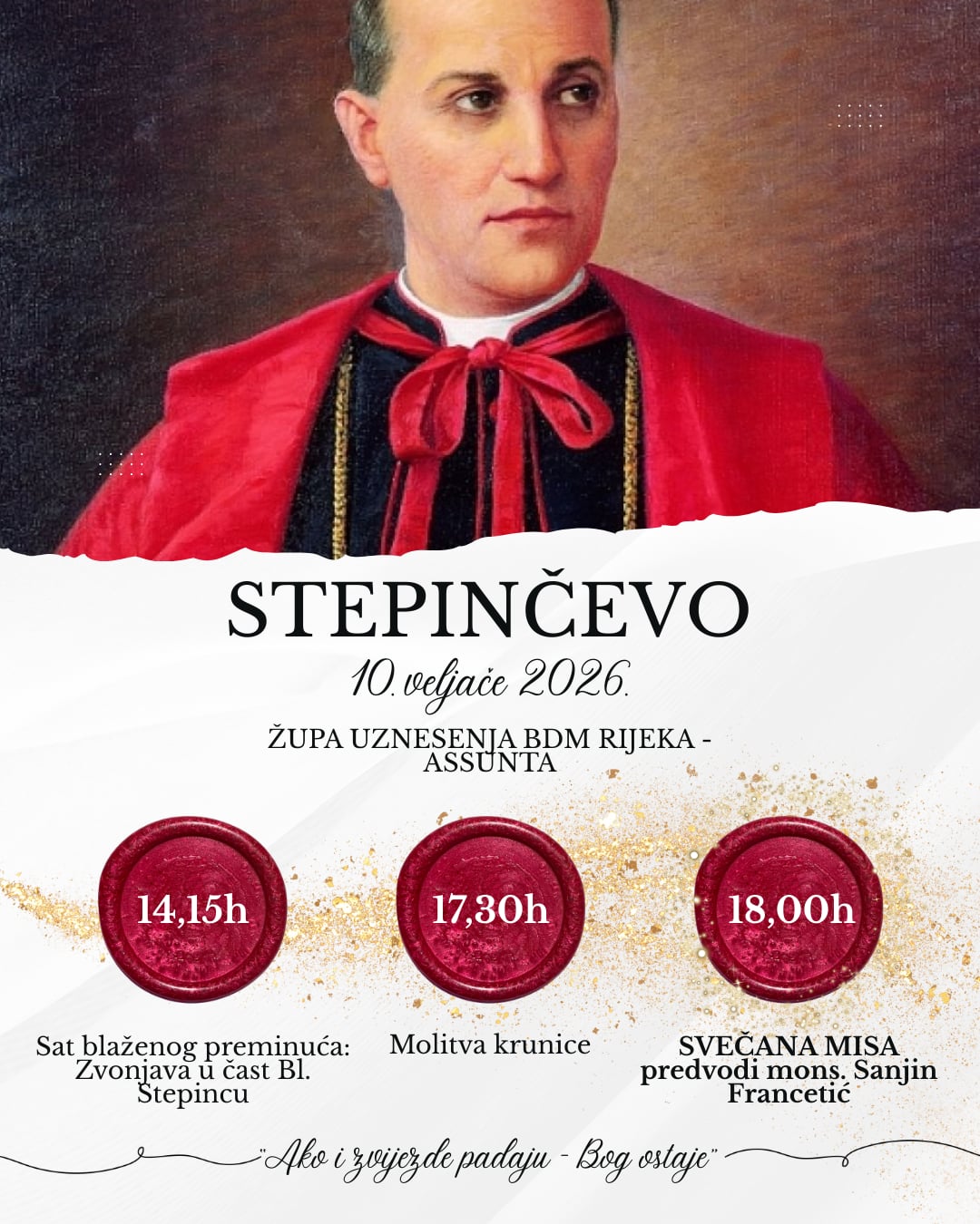 U Župi Uznesenja BDM – Assunta u Rijeci, u utorak, 10. veljače bit će proslavljeno Stepinčevo, dan blaženog Alojzija Stepinca – svjedoka vjere, nade i ljubavi prema Bogu i narodu.