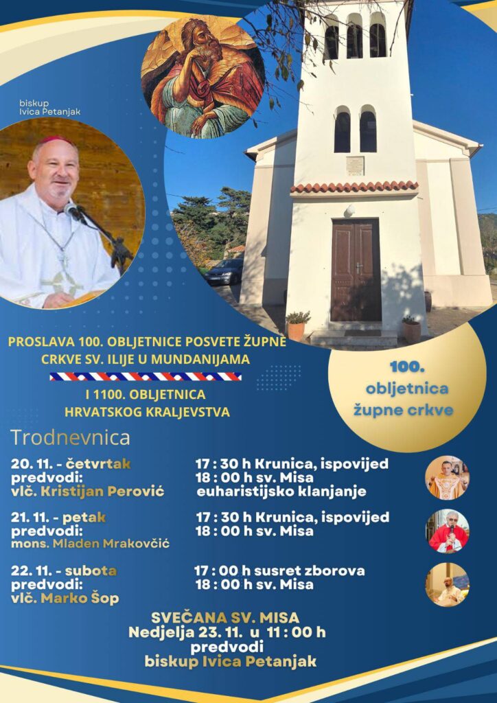 Obilježavanje stote obljetnice posvete crkve sv. Ilije u Mundanijama, koja je 1925. godine bila posvećena tisućitoj obljetnici Hrvatskoga Kraljevstva, održat će se od 20. do 23. studenoga. Crkva je podignuta na mjestu nekadašnje kapele sv. Ilije uništene 1923., a prva misa u obnovljenoj i nadograđenoj crkvi slavljena je 7. prosinca 1924. Ovaj povijesni jubilej potaknuo je župnika vlč. Josipa Kosića na organiziranje posebnog programa uz potporu župnog vijeća, domaćice Ružice Matijević i Grada Raba.
