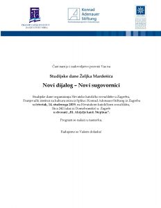 U organizaciji Hrvatskog katoličkog sveučilišta u Zagrebu, Franjevačkog instituta za kulturu mira iz Splita i Konrad Adenauer Stiftung iz Zagreba u četvrtak, 14. studenoga s početkom u 10 sati na Hrvatskom katoličkom sveučilištu, Ilica 242 (ulaz iz Domobranske) u Zagreb u dvorani „Bl. Alojzije kard. Stepinac“ održat će se Studijski dani Željka Mardešića na temu “Novi dijalog – Novi sugovornici”.