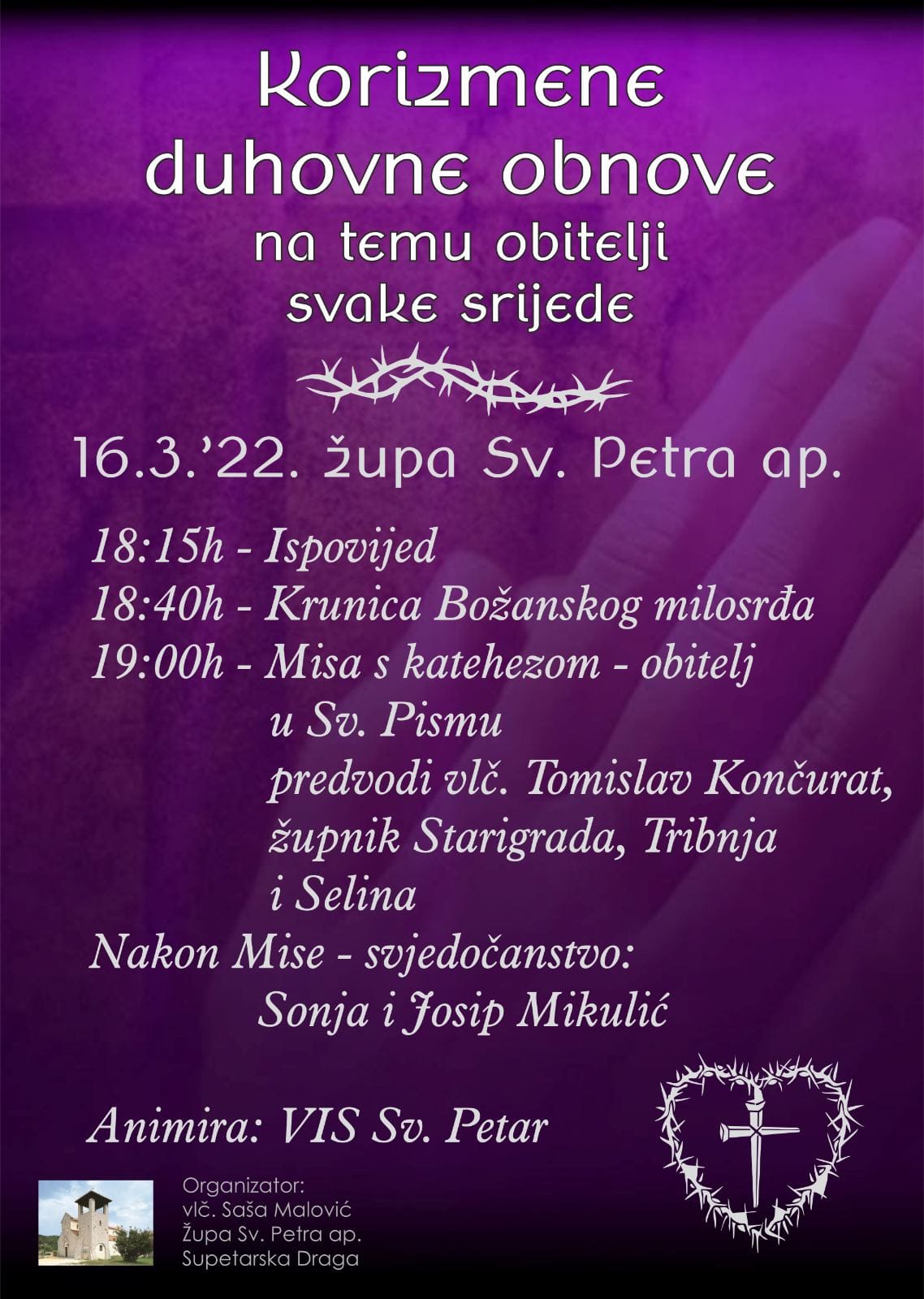 Župa Svetog Petra apostola –  Supetarska Draga priređuje svake srijede korizmene duhovne obnove o temi obitelji. U srijedu 16. ožujka misu s katehezom Obitelj u Svetom pismu predvodi župnik Starigrada, Tribnja i Selina Tomislav Končurat s početkom u 19 sati.