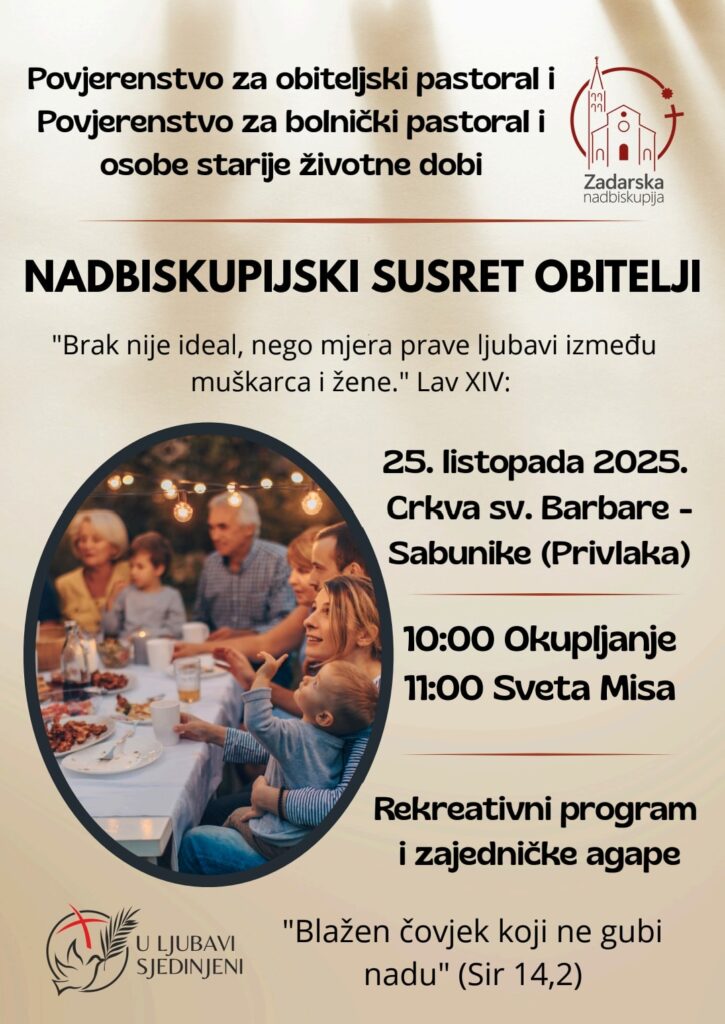 Susret obitelji Zadarske nadbiskupije održat će se u subotu, 25. listopada, kod crkve sv. Barbare u predjelu Sabunike u župi Rođenja Blažene Djevice Marije u Privlaci. Misno slavlje u 11 sati predvodit će zadarski nadbiskup Milan Zgrablić.
