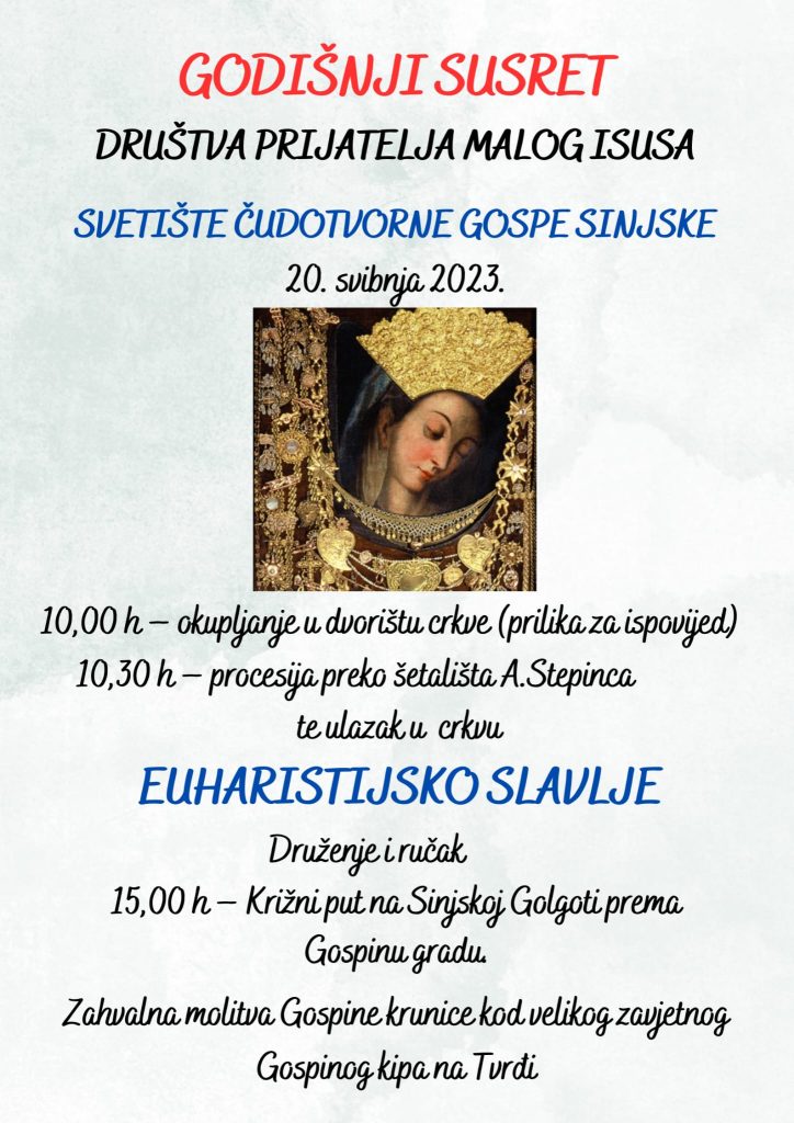 Godišnji susret Prijatelja malog Isusa splitske provincije bit će 20. svibnja 2023. u svetištu Čudotvorne Gospe Sinjske u Sinju. Susret počinje u 10 sati s mogućnošću ispovijedi i nastavlja se procesijom i slavljem mise u 10:30. Nakon mise će uslijediti druženje i ručak te slobodno vrijeme. Od 15 sati je križni put na sinjskoj Golgoti. Susret završava zahvalnom molitvom krunice kod zavjetnog kipa Blažene Djevice Marije na Tvrđavi.