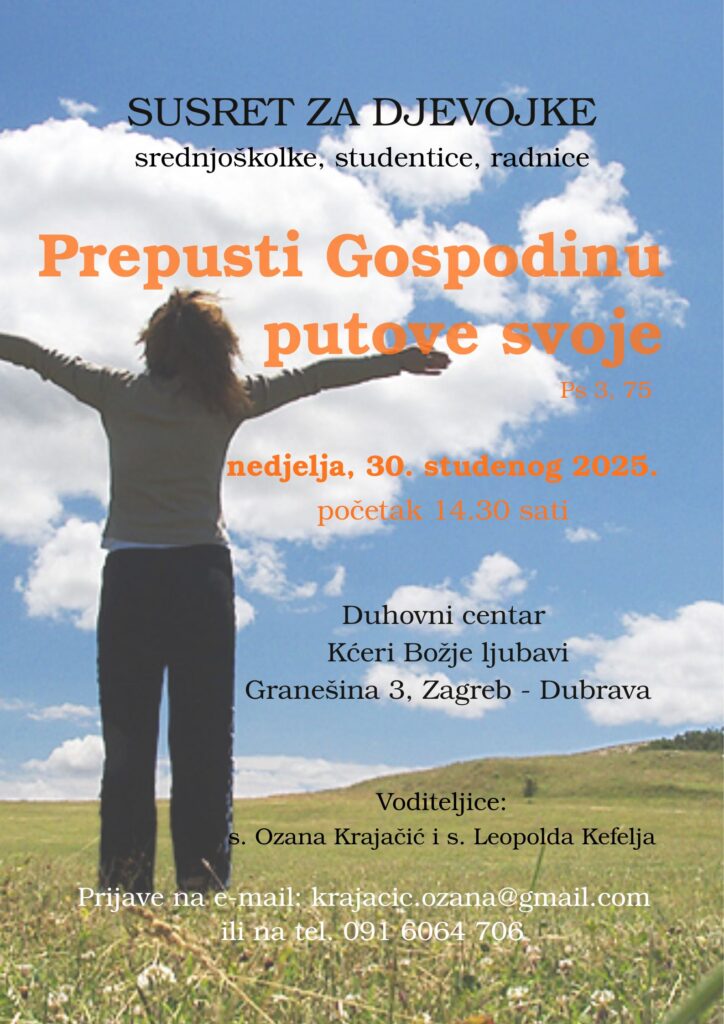Susret za djevojke „Prepusti Gospodinu putove svoje“ održat će se u nedjelju 30. studenoga s početkom u 14:30 u Duhovnom centru Kćeri Božje ljubavi u zagrebačkoj Granešini. Voditeljice susreta su s. Ozana Krajačić i s. Leopolda Kefelja.
