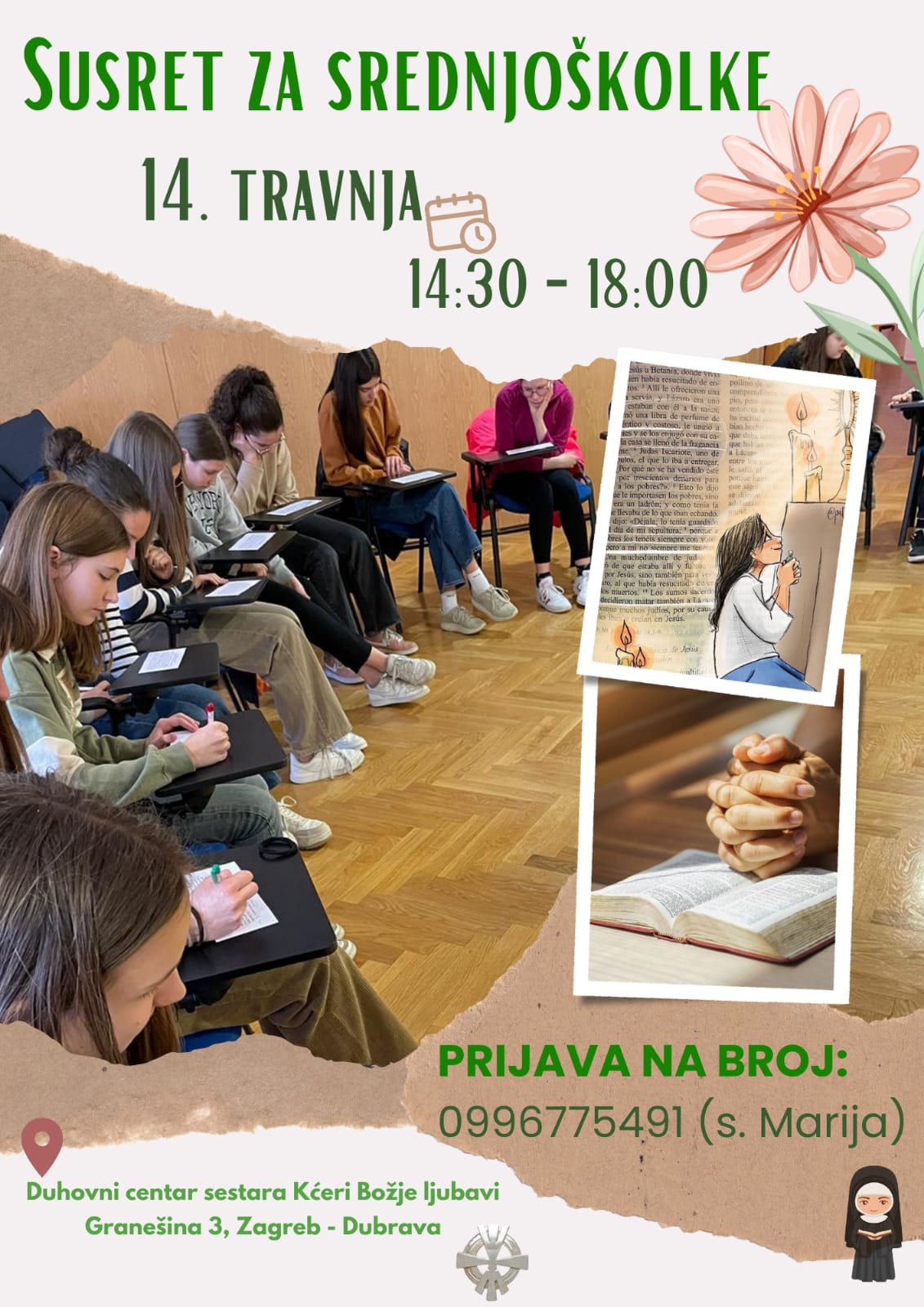 Kćeri Božje ljubavi organiziraju susret za srednjoškolke, koji će se održati u nedjelju 14. travnja s početkom u 14:30 u njihovom Duhovnom centru (Granešina 3, Zagreb − Dubrava).