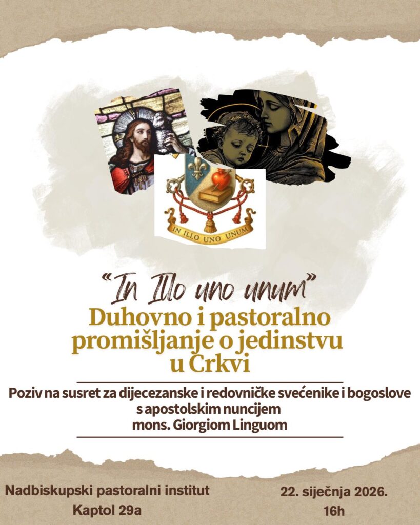 Apostolski nuncij u Republici Hrvatskoj nadbiskup Giorgio Lingua održat će susret za dijecezanske i redovničke svećenike i bogoslove naslovljen „In Illo uno unum – Duhovno i pastoralno promišljanje o jedinstvu u Crkvi“ u četvrtak 22. siječnja u 16 sati u Nadbiskupijskome pastoralnom institutu u Zagrebu, Kaptol 29a.