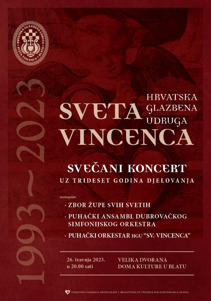 Hrvatska glazbena udruga Sveta Vincenca proslavlja 30 godina djelovanja te će tim povodom u velikoj dvorani Doma kulture u Blatu na otoku Korčuli u srijedu 26. travnja u 20 sati održati svečani koncert.