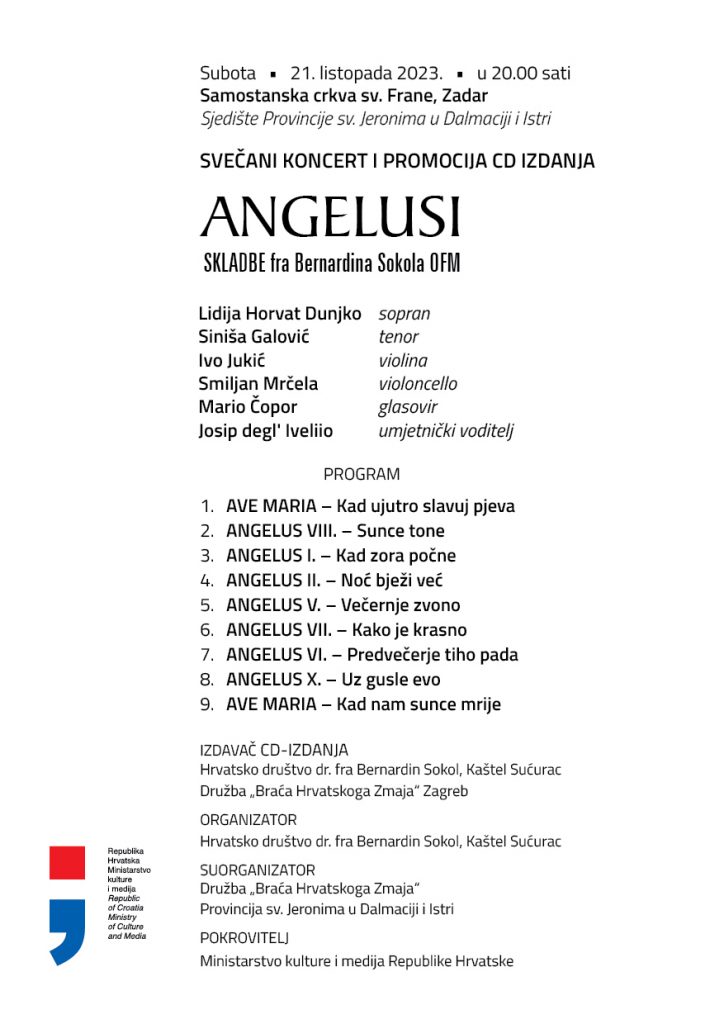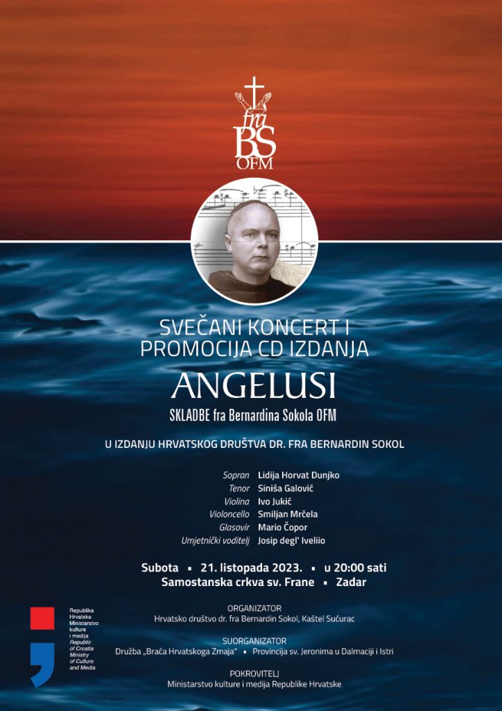 Svečani koncert i promocija CD izdanja „Angelusi – skladbe fra Bernardina Sokola“ održat će se u subotu 21. listopada 2023. u 20 sati u samostanskoj crkvi sv. Frane u Zadru.