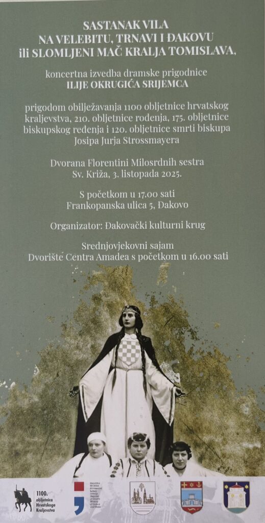 Središnji događaj je koncertna izvedba dramske prigodnice Ilije Okrugića Srijemca “Sastanak vila na Velebitu, Trnavi i Đakovu ili Slomljeni mač kralja Tomislava”, koja će se izvesti u 17.00 u dvorani Florentini Samostana Milosrdnih sestara sv. Križa, Frankopanska 5, Đakovo. Ovim se nastupom ujedno obilježavaju i 220. obljetnica rođenja, 175. obljetnica biskupskog ređenja te 120. obljetnica smrti biskupa Josipa Jurja Strossmayera. Predstava se, nakon 137 godina, izvodi po prvi put, u scenarističkoj prilagodbi Mirka Ćurića i Darka Milasa te u režiji Darka Milasa.