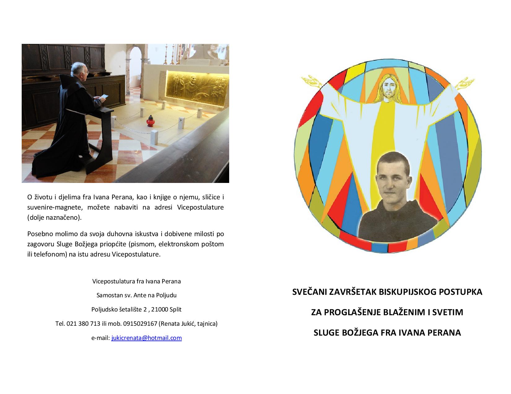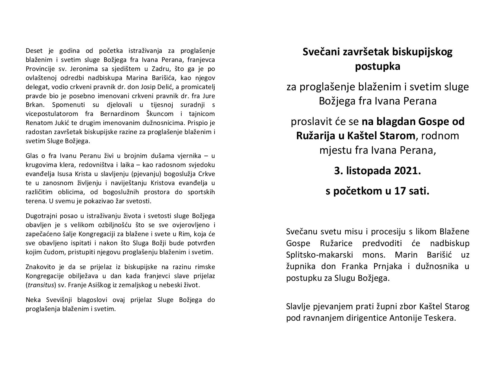 Svečani završetak biskupijskog postupka za proglašenje blaženim i svetim sluge Božjega fra Ivana Perana proslavit će se na blagdan Gospe od Ružarija u Kaštel Starom, rodnom mjestu fra Ivana Perana, 3. listopada 2021. s početkom u 17 sati.
