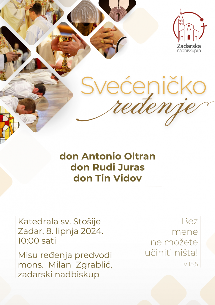 Zadar, (IKA) – Za vrijeme svečanog misnog slavlja u subotu, 8. lipnja, u katedrali sv. Stošije u Zadru s početkom u 10 sati, zadarski nadbiskup Milan Zgrablić za svećenike će zarediti trojicu đakona Zadarske nadbiskupije. To su Antonio Oltran, Rudi Juras i Tin Vidov.