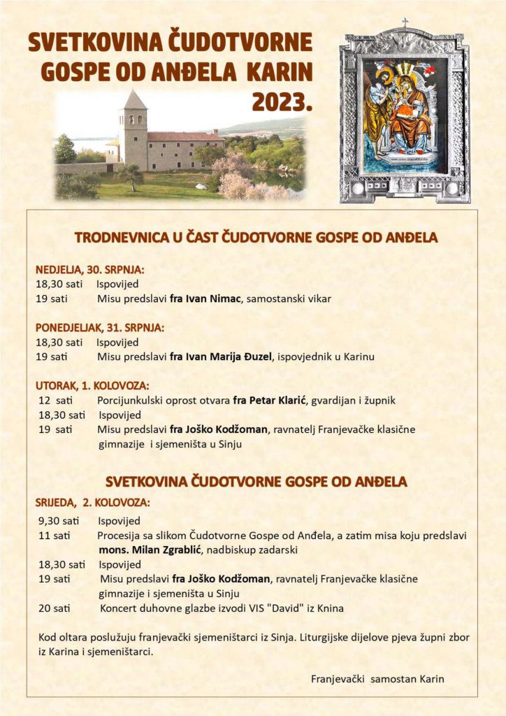 Karin, (IKA) – Svetkovina Čudotvorne Gospe od Anđela svečano će biti proslavljena u srijedu 2. kolovoza u Karinu. U 11 sati krenut će procesija sa slikom Čudotvorne Gospe od Anđela, Svečanu misu predvodit će zadarski nadbiskup Milan Zgrablić. Misu u 19 sati slavit će ravnatelj Franjevačke klasične gimnazije i sjemeništa u Sinju fra Joško Kodžoman. U 20 sati bit će koncert duhovne glazbe VIS-a „David“.