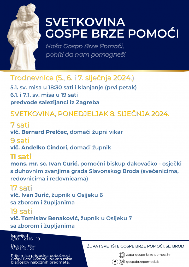 Slavonski Brod, (IKA) – Svetkovina Gospe Brze Pomoći proslavlja se u ponedjeljak, 8. siječnja u istoimenom svetištu u Slavonskom Brodu.