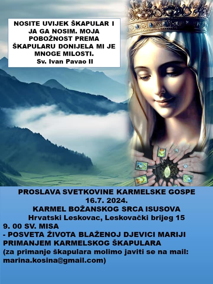 Svetkovina Gospe Karmelske bit će proslavljena u Karmelu Božanskog Srca Isusova u Hrvatskom Leskovcu u Zagrebu, u utorak 16. srpnja 2024. misom u 9 sati.